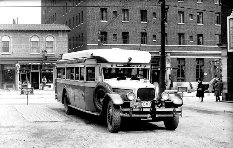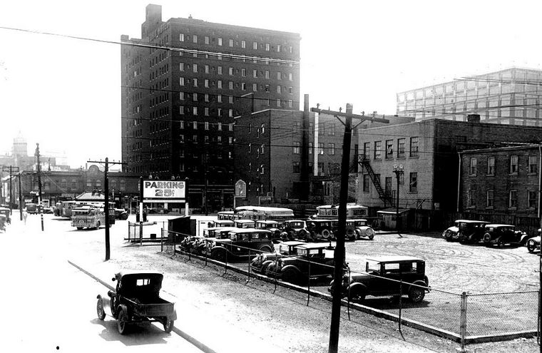 Gray Coach Lines Open bus terminal beyond parking lot. Ford Hotel in background. June 10, 1931 Toronto Archives