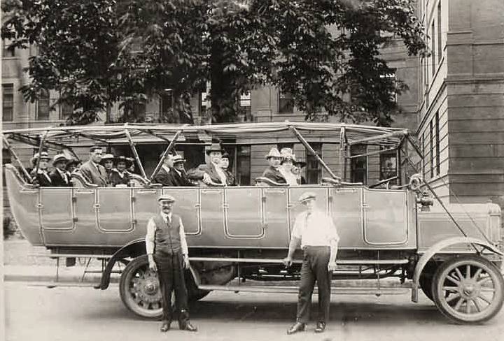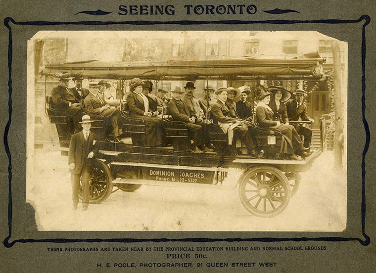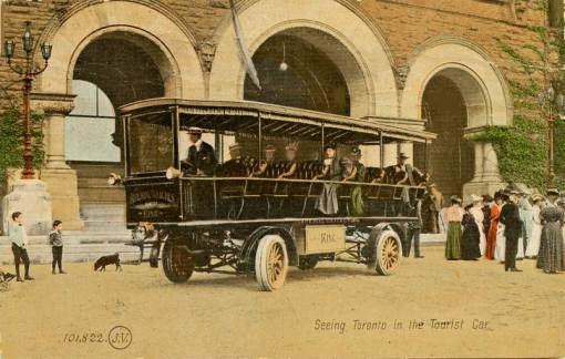 Unidentified open sightseeing bus believed to be in Toronto. Circa 1920