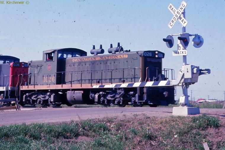 1026 leads another unit in then new CN paint scheme over a 3 track level crossing in South Edmonton. 5/1967