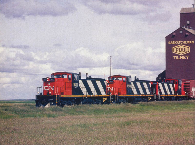 1611-1610-1604 working on a branchline in Tilney, SK. 7/15/1993 J.S.Kozma/Joseph Testagrose Collection