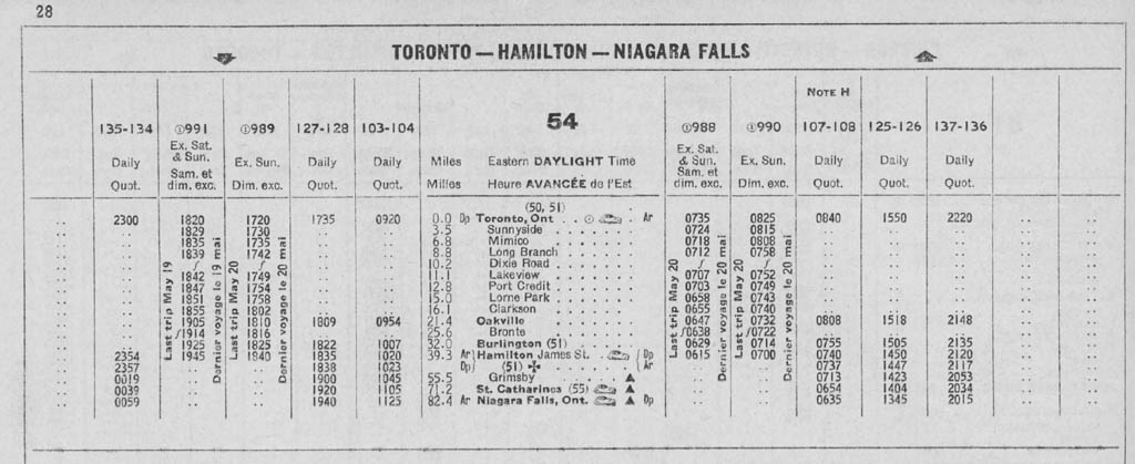 of two trains just one year away from discontinuance. Only one train operated on Saturday. Last public time table effective April 30, 1967. Effective May 23, 1967 GO Transit would begin train operations between