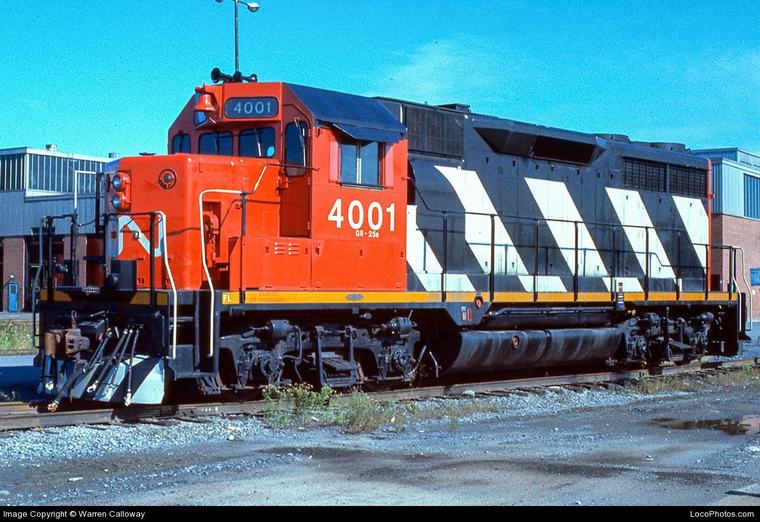 4001 in new paint scheme. Montreal 9/02/1976 GMD GP40 3000 hp 4002-4017 65 mph