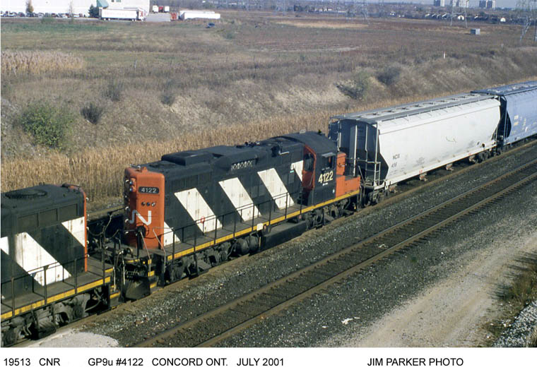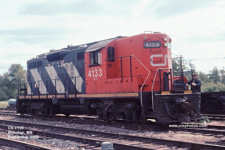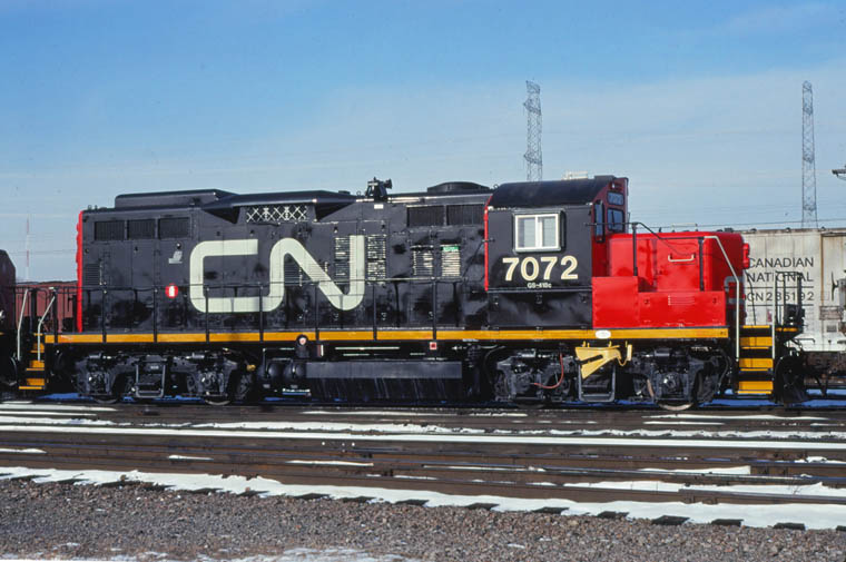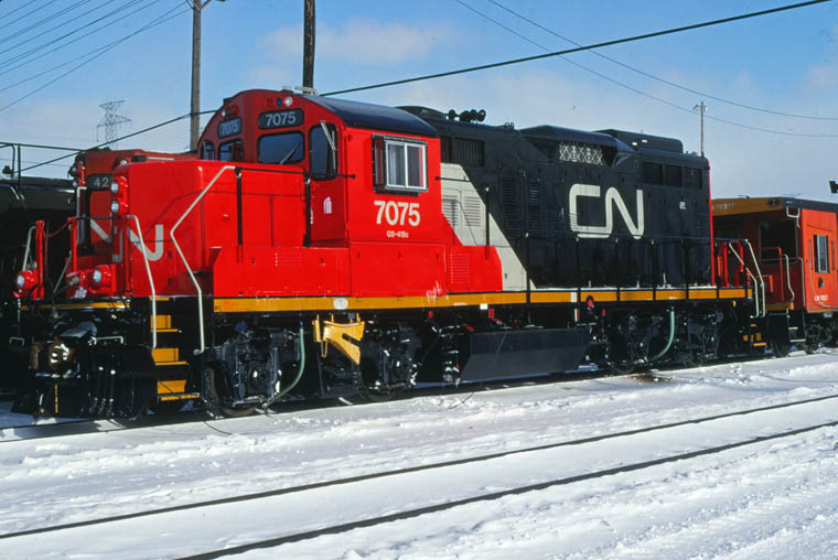 7075 (10/1992 ex 4252) GMD A1518 4/1958 Note newer style paint scheme. Smaller CN and unit number. Red cab side. Grey on carbody. |