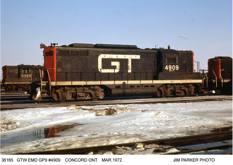 GTW 4909_4922 passenger GP9's (4907-4922 16 units 83 mph) Chicago-Toronto. EMD 22857 1/1957. GT 4909 new paint scheme and no longer in passenger service.