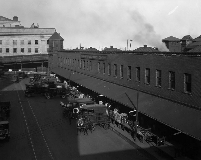 Freight sheds on Front Street West fronting on Simcoe Street. Looking east. Old union station at far right. 1926