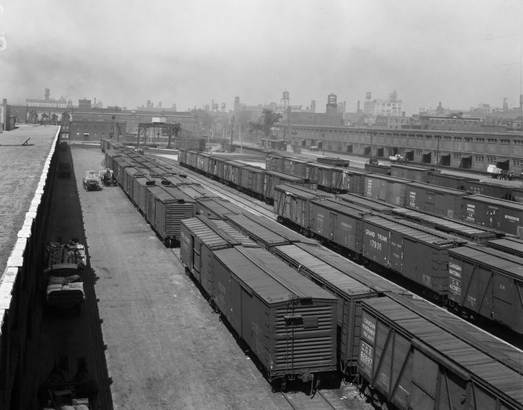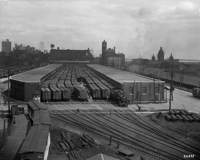 Team tracks looking west. Freight shed at far right along Wellington Street West is CPR King Street shed.