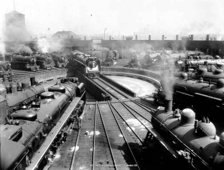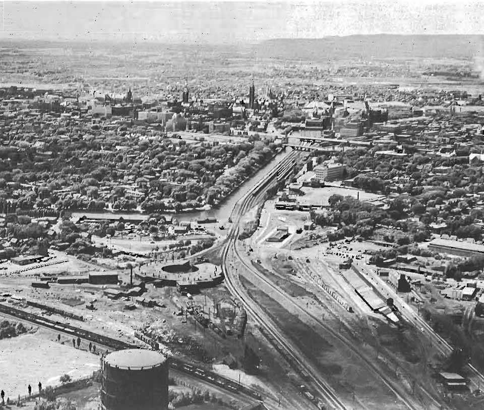 CNR Ottawa East roundhouse. Coach Yard in middle and Ottawa Union Station in distance.