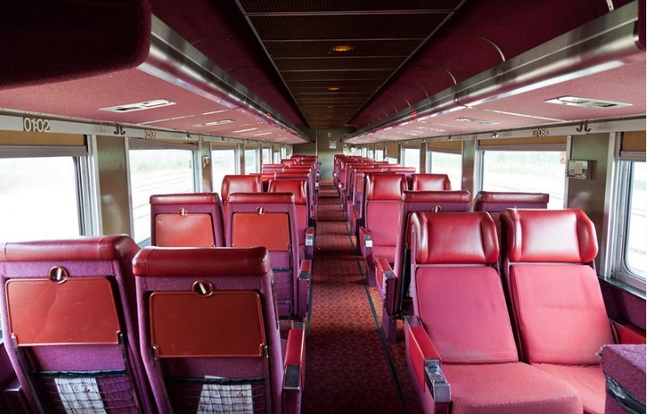 Daynighter interior with 52 reclining seats that include drop down table on rear.