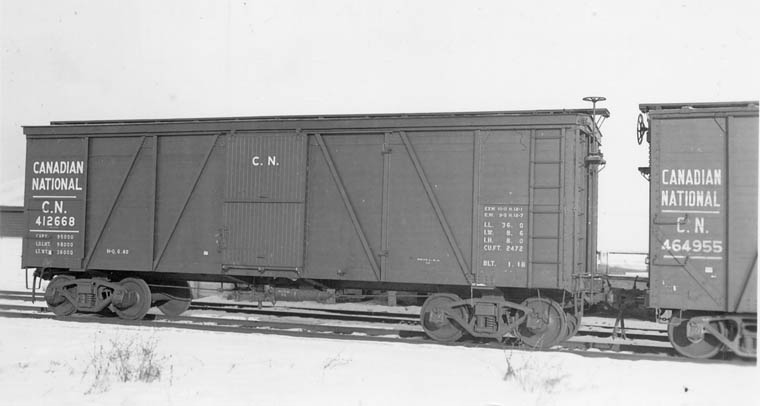CN 412668 36'0" steel underframe wooden box car 5 foot door. 2472 cubic feet. Built 1/1918 Bud Laws Collection
