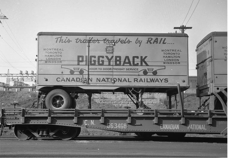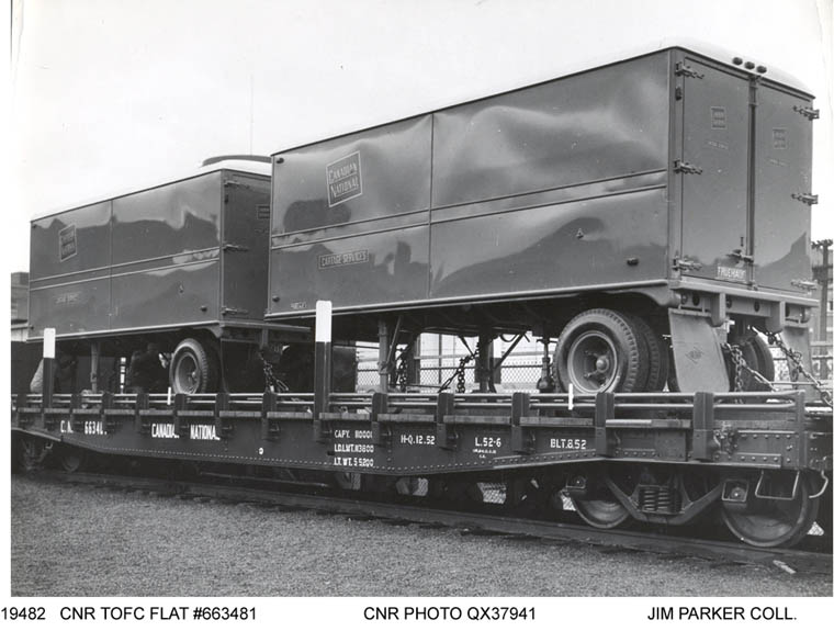 Great advertising! CN 663468 piggyback flatcar holding two short railway-owned trailers. 1950's Jim Parker