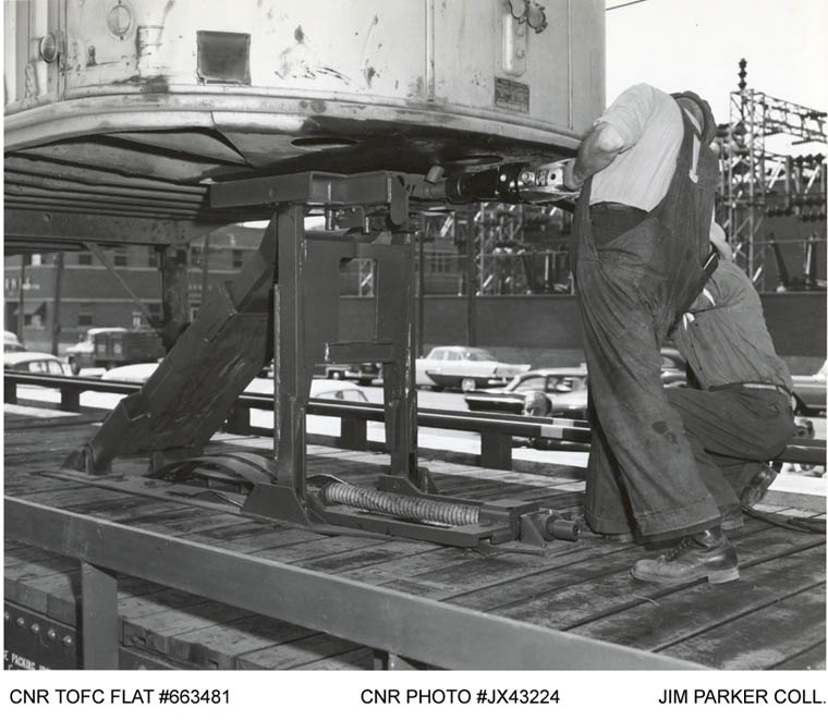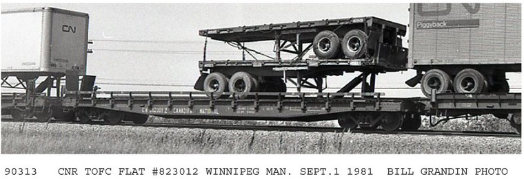 New piggyback 52 foot 6 inch flat car with new CN Cartage Services (LCL freight) trailers.