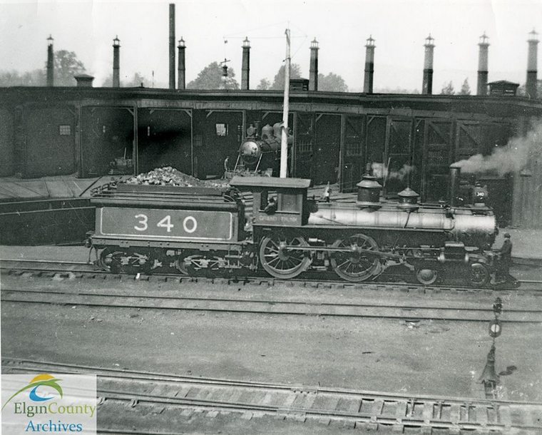 GTR 340 backing up past the roundhouse in St.Thomas.
