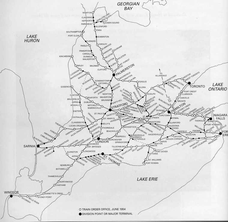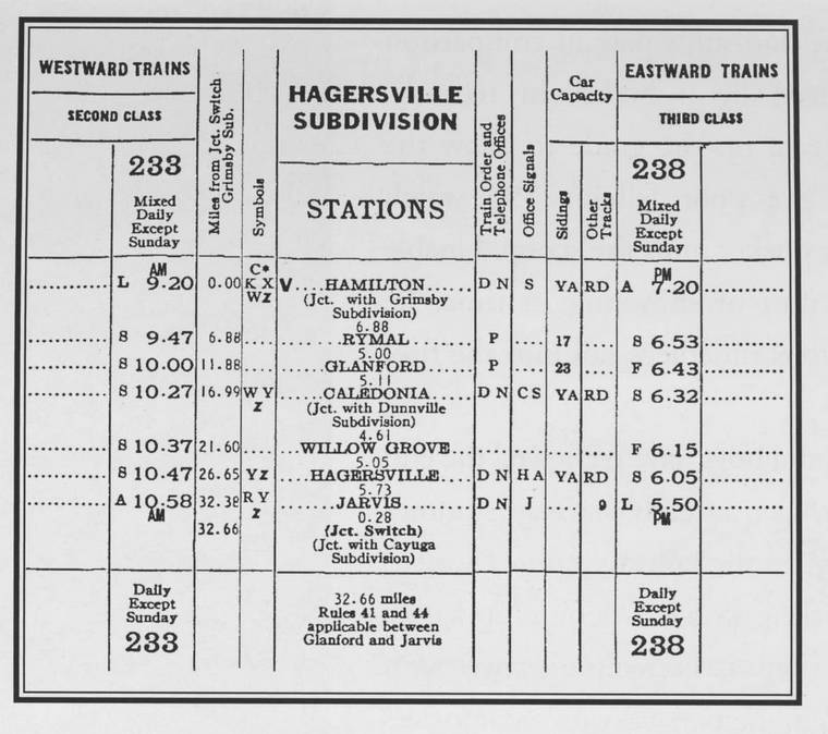 and others refer to Ian Wilson's excellent book Hamilton-Caledonia-Hagersville-Jarvis-Simcoe-Port Rowan-Port Dover. Map of southwestern Ontario CNR lines 1954. Employee time table