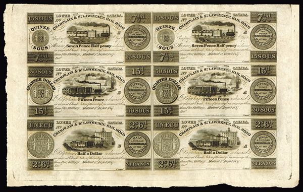 Full sheet of paper money printed in pairs of three different vignettes and values.