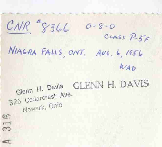 8366 MLW 67795 5/1929 Niagara Falls August 6, 1956 Glenn H. Davis/Bud Laws Collection P-5-g 8370-8381 (12 engs)Baldwin 1929 same specs. P-5-h 8382-8416 Cyl. 22" x 28" Drv. 51" Press. 220 t.e. 50% CNR 1930-31 Note: Engines in this sub-class were all built