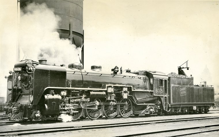 6042 with experimental smoke deflector and feedwater heater. Winnipeg 1933