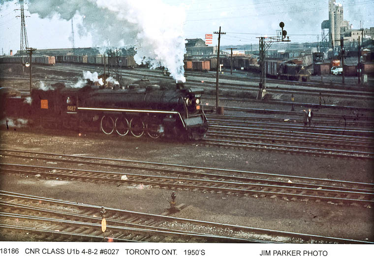 Interesting detail in this photograph of slightly blurred engine westbound approaching Bathurst Street (Front Street West in background) caused not by its speed which would be quite slow but rather by the very low film speed (ASA 10) of colour film back then. Switchtenders shack with coal/coke bin, low mounted loudspeaker(atop white post) used by towerman to communicate with switchtenders. Low switch stands and a higher one.