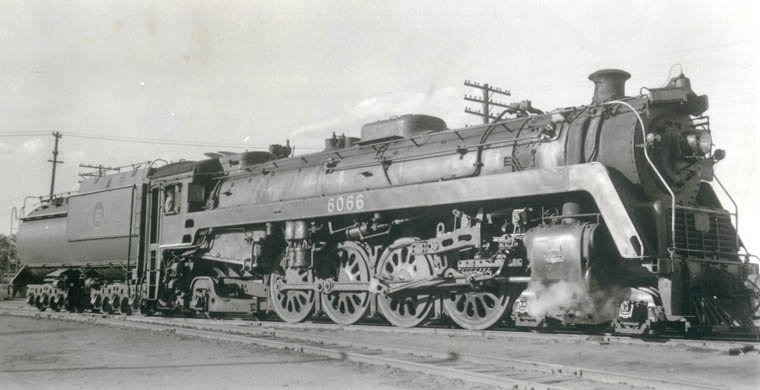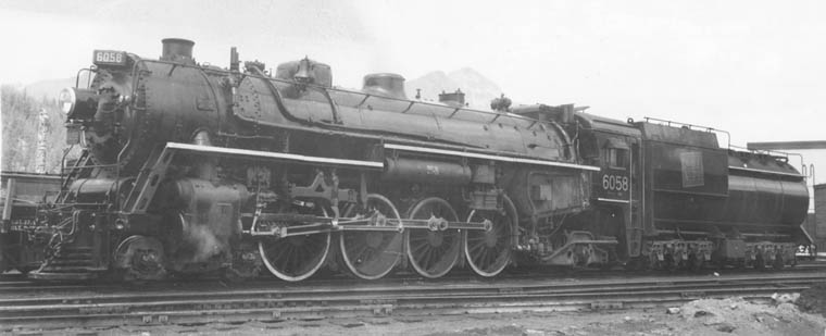 6058 in better weather at Jasper. November 1942 Bud Laws Collection U-1-f 6060-6079 (20) MLW 1944 Newer version of the 4-8-2 wheel arrangement came with some streamlining including a nose cone that gave these engines their nickname "Bullet nose Betty". Cap stack and Vanderbilt tender added to their pleasing appearance second only to the 5700 Hudsons.