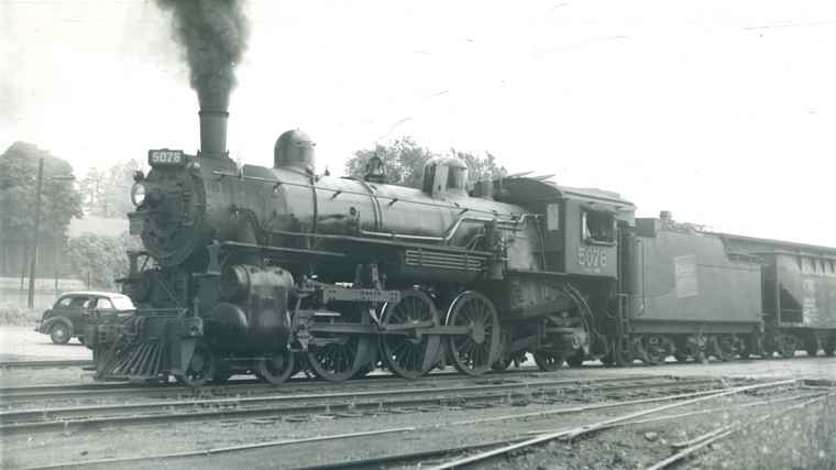 5078 making a little too much black smoke standing still! Galt,ON July 27, 1950 F.J.Bechtel/Bud Laws Collection J-4-a subclass 5080-5084 (5) ex CGR 453-457 Cyl. 23 1/2" x 28" Drv. 69" Press. 180 lbs. t.e. 34%