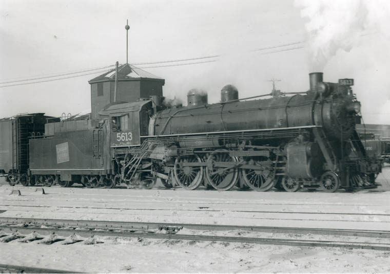 K-3-g 5613 in a winter scene in Regina. Note the CPR engine in the background. Bud Laws Collection