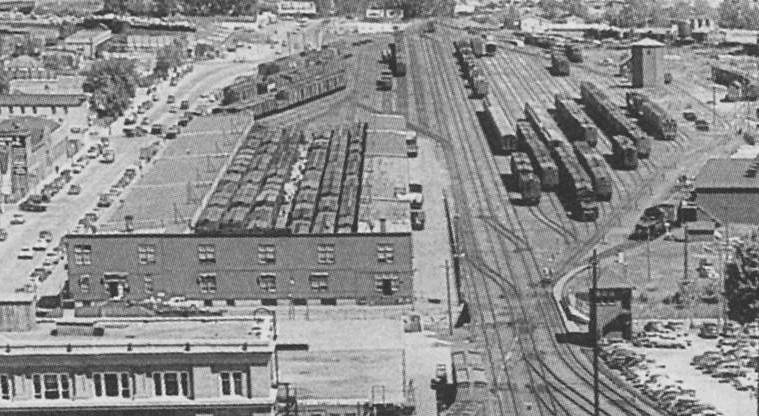 Above: 1952 Closeup of express shed and freight yard in background.