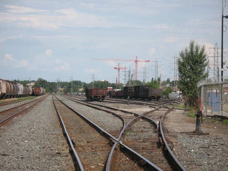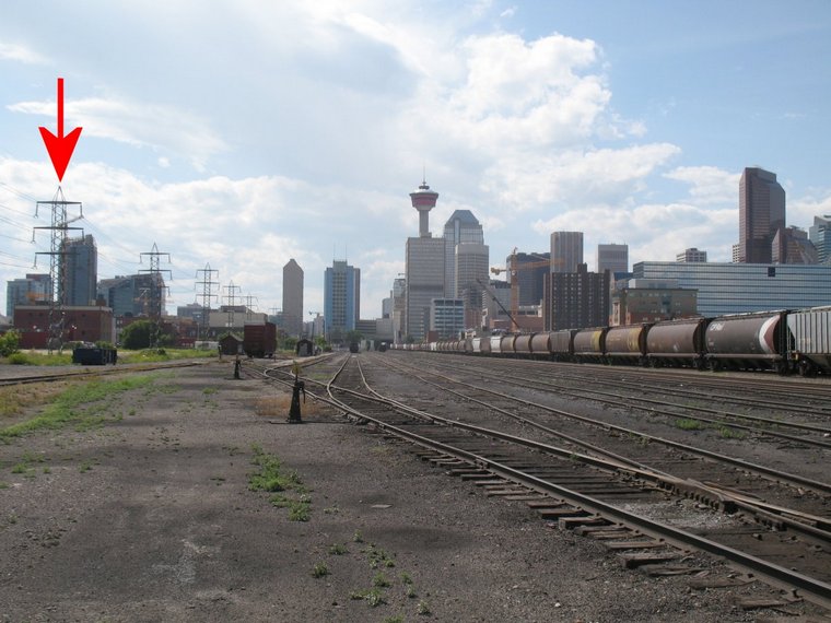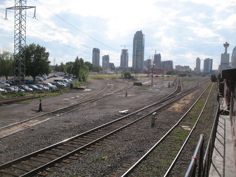 west. See below. The seven track I yard just east of the Calgary Tower