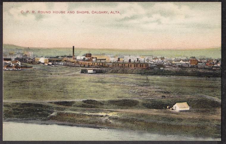 Old hand coloured postcard showing roundhouse and shops. Doug Phillips Collection The roundhouse was built in 1899 when Calgary became a division point and terminal and Gleichen and Canmore were closed. For a short time 1890-1898 a small engine house was located when the north end of the wye is north of present 12th Street tower. This engine house was used by engines for the C&E Railway. The Calgary and Edmonton had no locomotives and CP steam was used on both the Edmonton branch and the MacLeod Branch, although this branch stopped short on the north side of the Crowsnest River at West MacLeod. Alyth was built starting in 1914 and the round house next to the Elbow River was then called West Shops. These closed in 1931 and demolished in 1935. That round house was an all stone structure. Doug Phillips