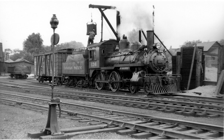 Water tank and two new-style coal towers still in place. Stock car likely contains ties or other OCS material. Ontario