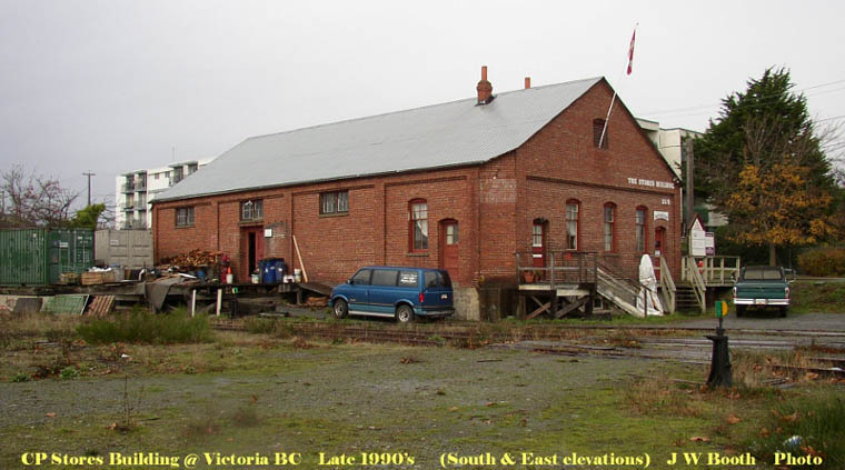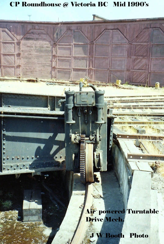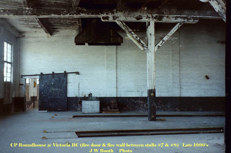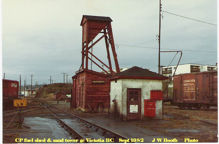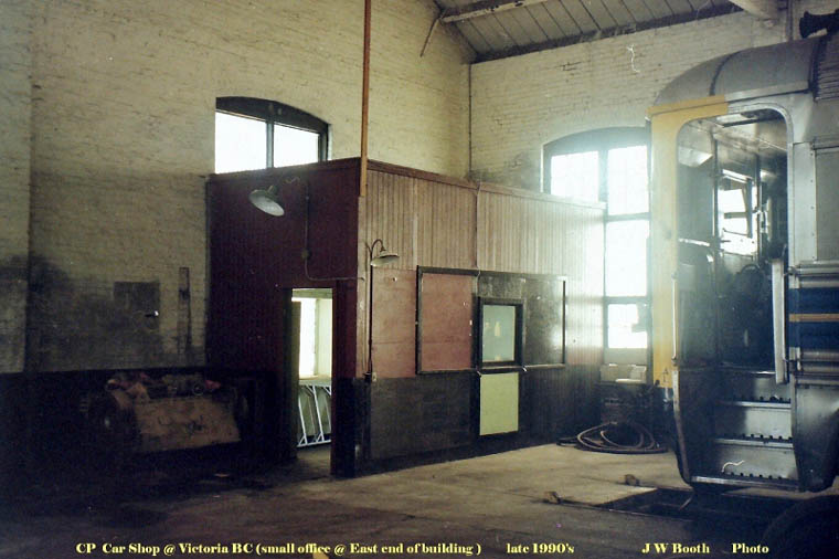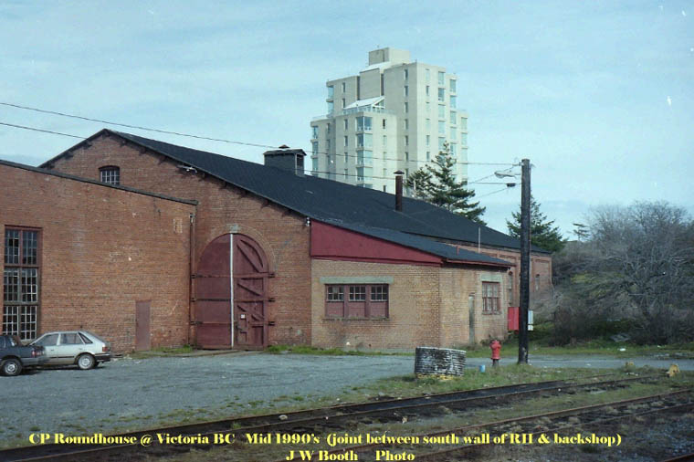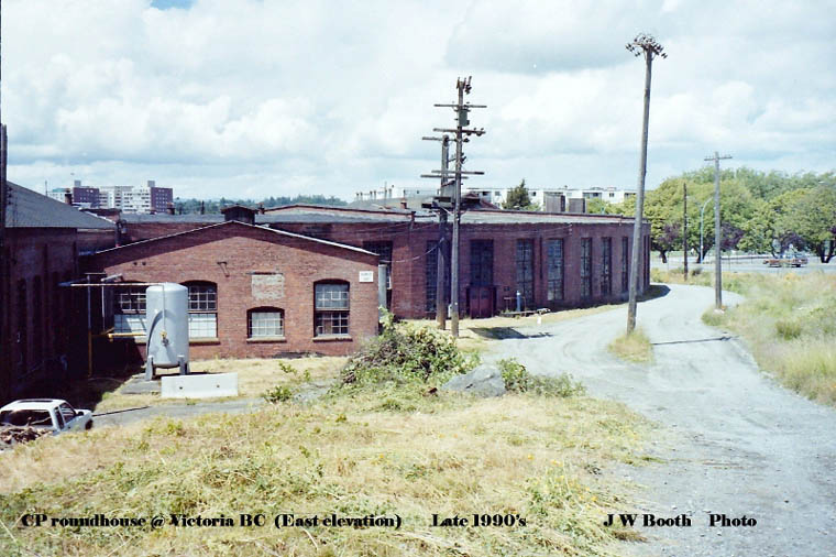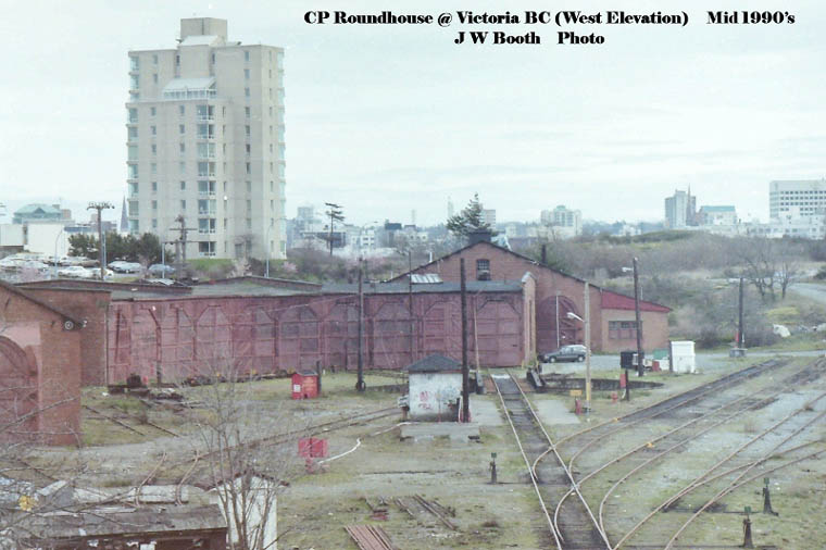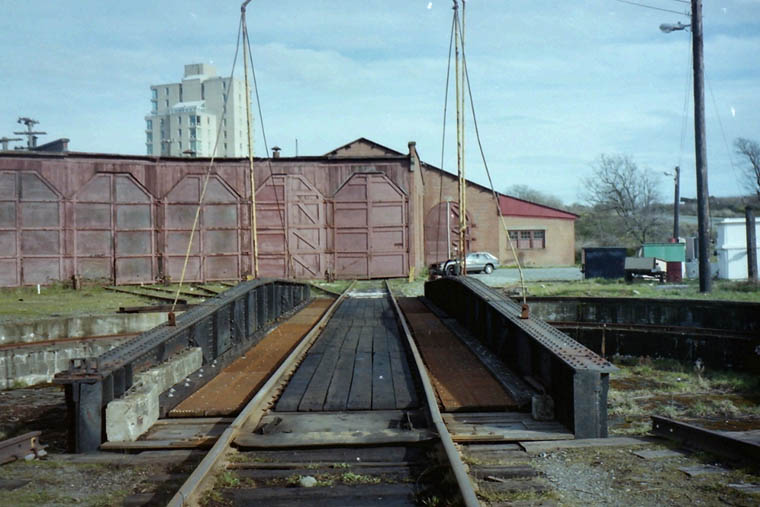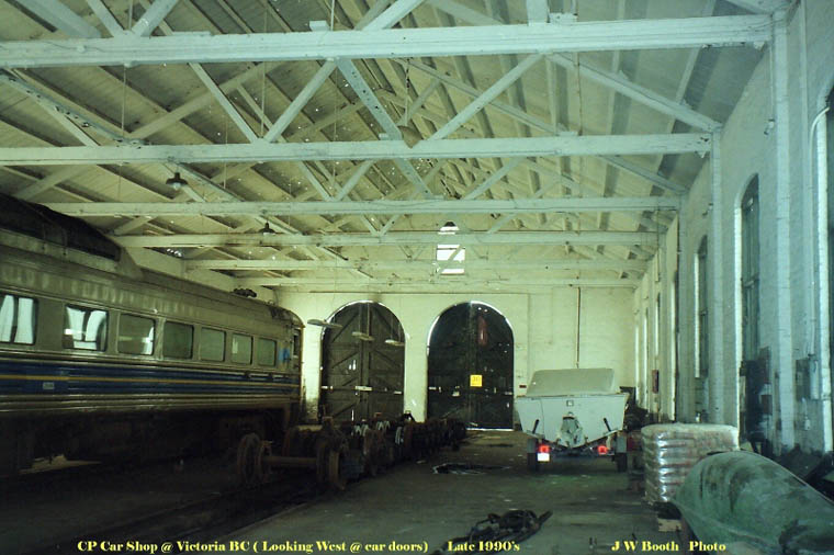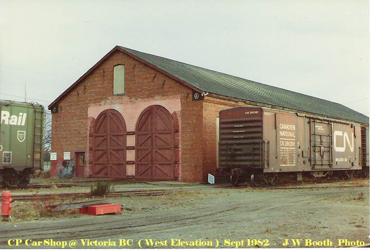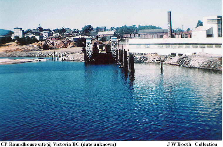 In the distance directly behind the slip dock is the Stores Department building (light roof) and to the right is the Car shop. Downtown Victoria is beyond to the right. The car slip dock was operated by Island Tug and Barge connecting with Seattle. This dock on Lime Bay closed sometime in the 1980's leaving the main CP slip dock at Nanaimo to serve the island. On some occasions CP traffic came via the nearby CN slip dock. The large stack with SWEENEY on it was formerly the Sweeney Cooperage mill (1889-1981) which was shut down in 1948 when its operation was transferred to their Vancouver main location. Its use by the time of this undated photograph is unknown at present. Note: Redevelopment of Vancouver's False Creek area forced the closure of Sweeney's in 1981 and resulted in the sale of their machinery to McGinnis Wood Products, Inc. in Cuba, Missouri. A family owned business started in 1968 just as was the original Sweeney's which began in 1889. McGinnis continues making wooden barrels for bourbon and whiskey using white oak from the Ozarks of Missouri. Check out their website for an interesting brief slideshow of this fascinating work.