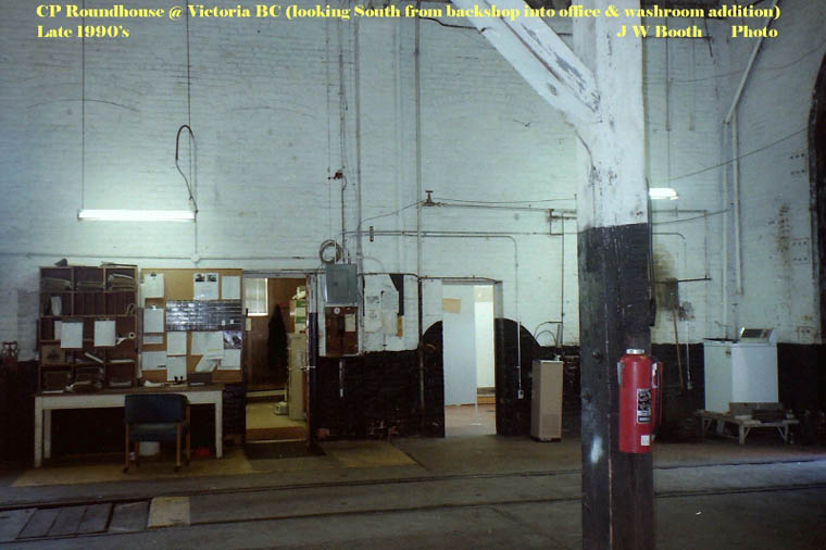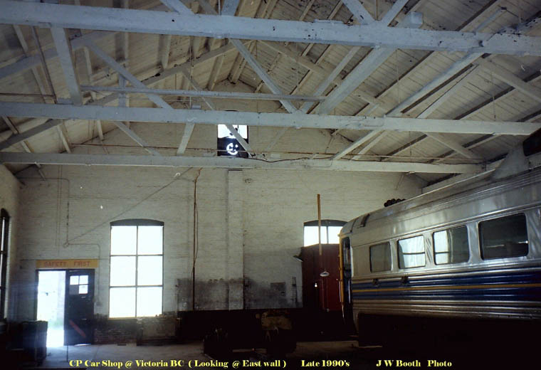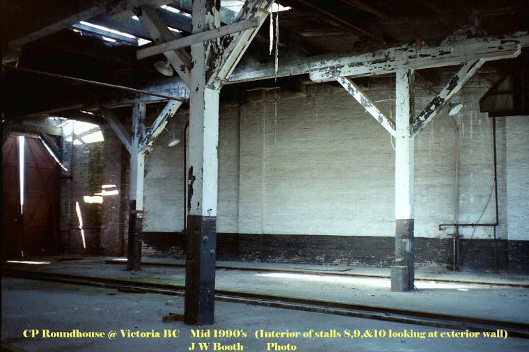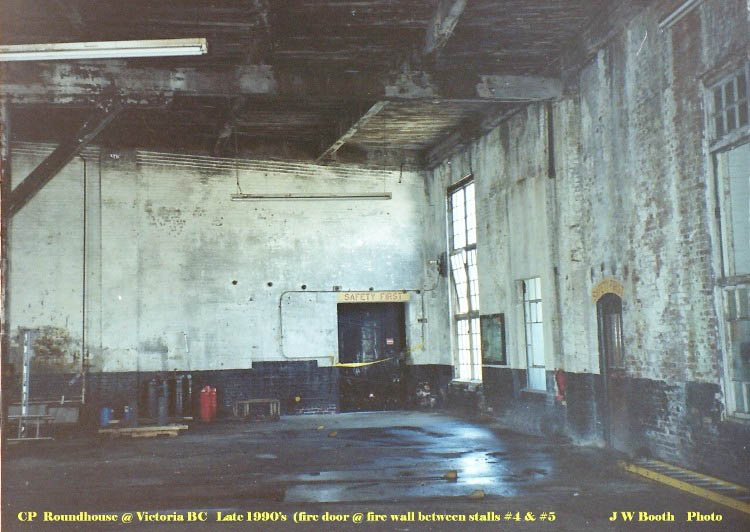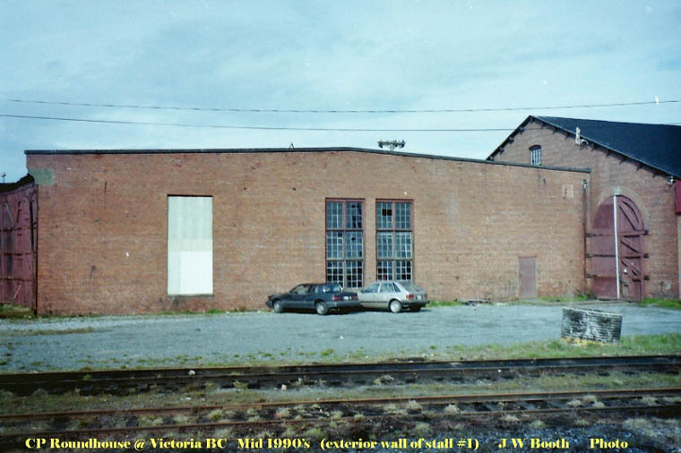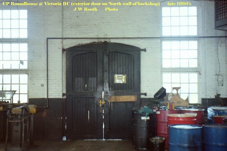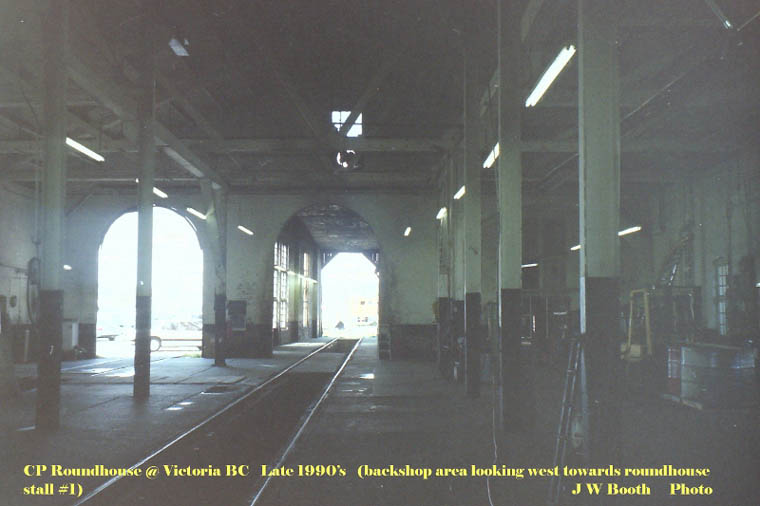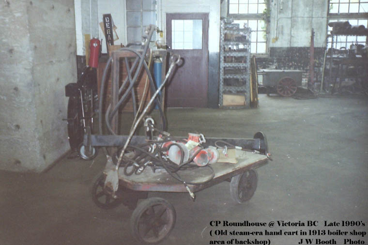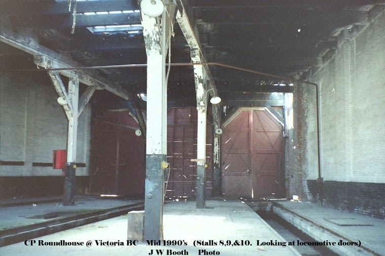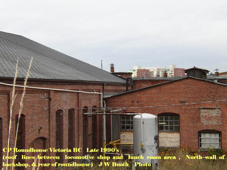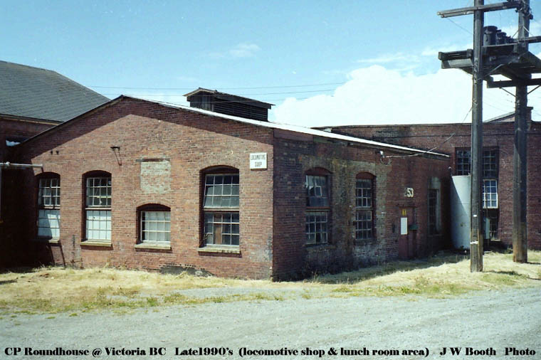 In the distance directly behind the slip dock is the Stores Department building (light roof) and to the right is the Car shop. Downtown Victoria is beyond to the right. The car slip dock was operated by Island Tug and Barge connecting with Seattle. This dock on Lime Bay closed sometime in the 1980's leaving the main CP slip dock at Nanaimo to serve the island. On some occasions CP traffic came via the nearby CN slip dock. The large stack with SWEENEY on it was formerly the Sweeney Cooperage mill (1889-1981) which was shut down in 1948 when its operation was transferred to their Vancouver main location. Its use by the time of this undated photograph is unknown at present. Note: Redevelopment of Vancouver's False Creek area forced the closure of Sweeney's in 1981 and resulted in the sale of their machinery to McGinnis Wood Products, Inc. in Cuba, Missouri. A family owned business started in 1968 just as was the original Sweeney's which began in 1889. McGinnis continues making wooden barrels for bourbon and whiskey using white oak from the Ozarks of Missouri. Check out their website for an interesting brief slideshow of this fascinating work.