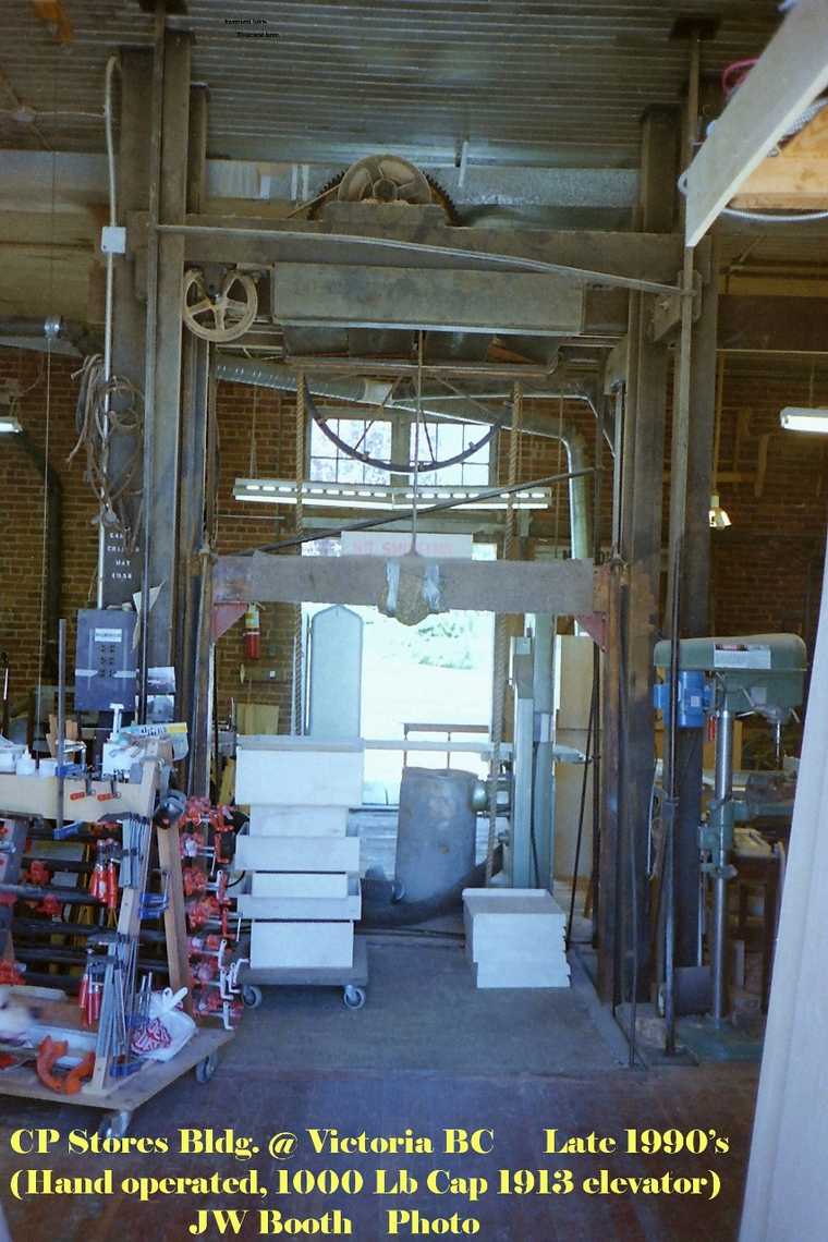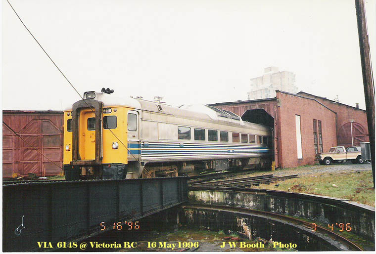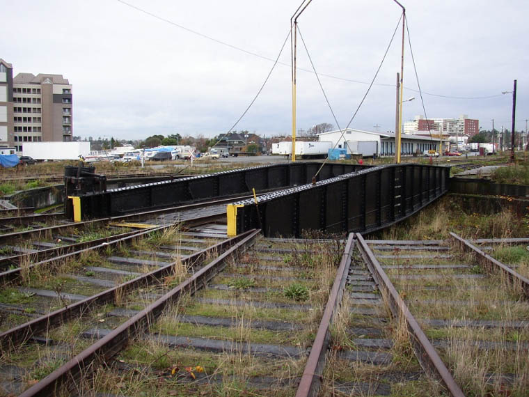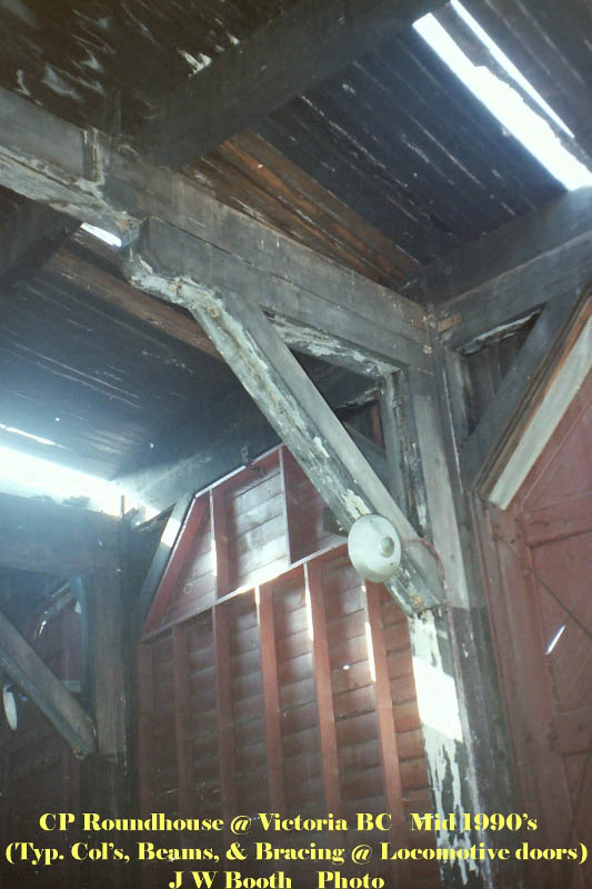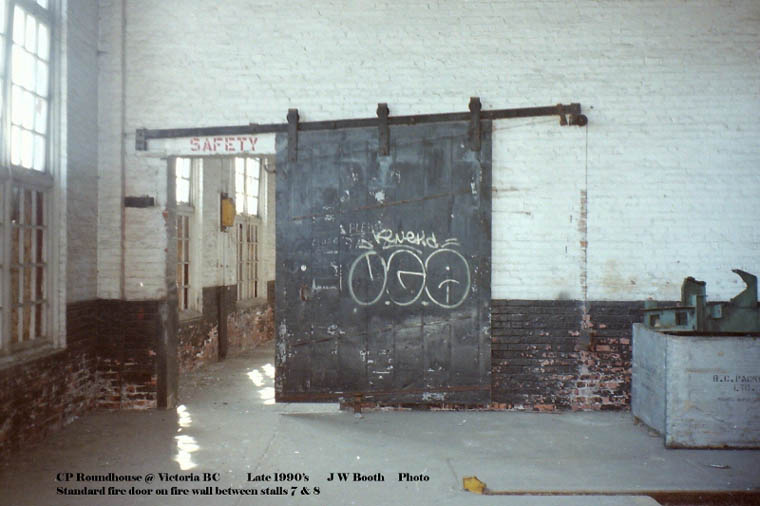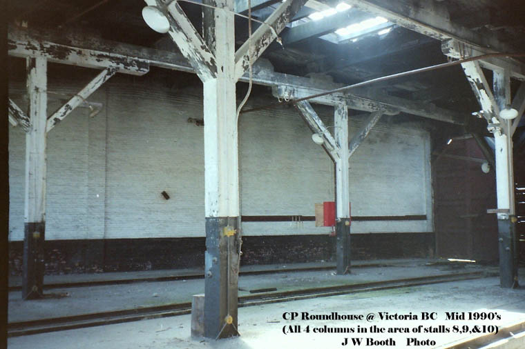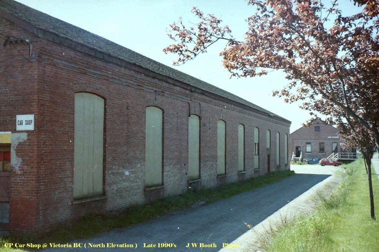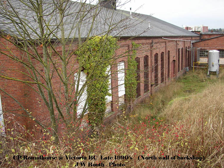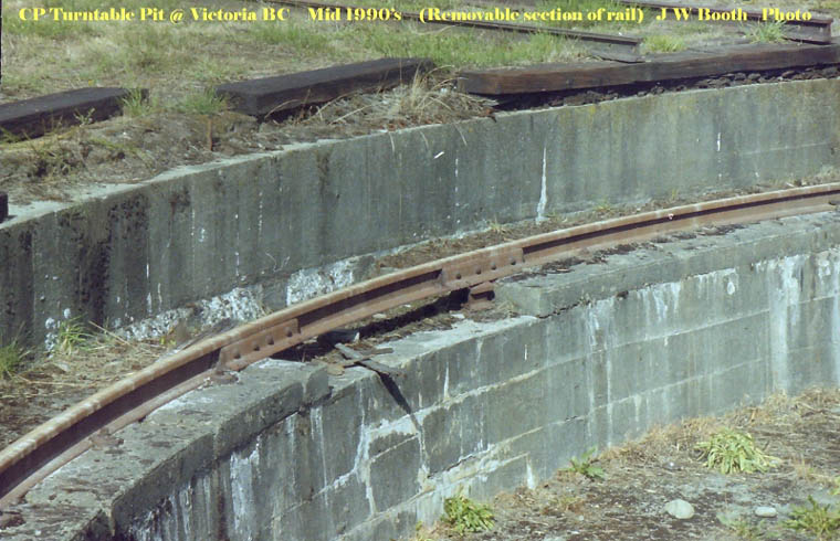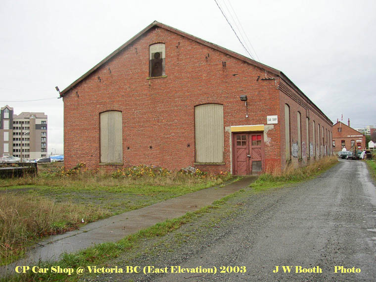 In the distance directly behind the slip dock is the Stores Department building (light roof) and to the right is the Car shop. Downtown Victoria is beyond to the right. The car slip dock was operated by Island Tug and Barge connecting with Seattle. This dock on Lime Bay closed sometime in the 1980's leaving the main CP slip dock at Nanaimo to serve the island. On some occasions CP traffic came via the nearby CN slip dock. The large stack with SWEENEY on it was formerly the Sweeney Cooperage mill (1889-1981) which was shut down in 1948 when its operation was transferred to their Vancouver main location. Its use by the time of this undated photograph is unknown at present. Note: Redevelopment of Vancouver's False Creek area forced the closure of Sweeney's in 1981 and resulted in the sale of their machinery to McGinnis Wood Products, Inc. in Cuba, Missouri. A family owned business started in 1968 just as was the original Sweeney's which began in 1889. McGinnis continues making wooden barrels for bourbon and whiskey using white oak from the Ozarks of Missouri. Check out their website for an interesting brief slideshow of this fascinating work.