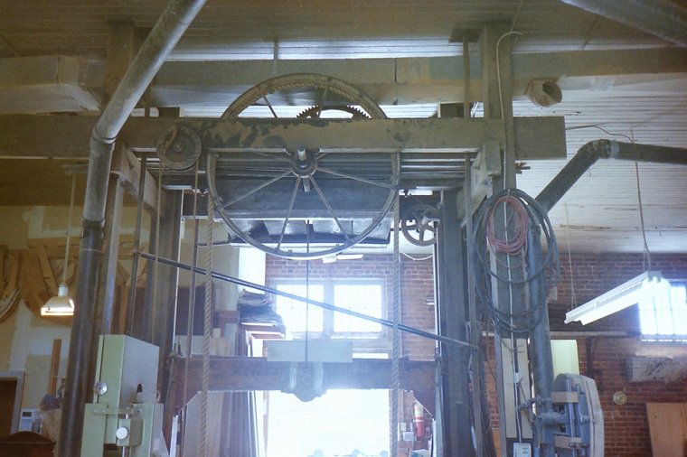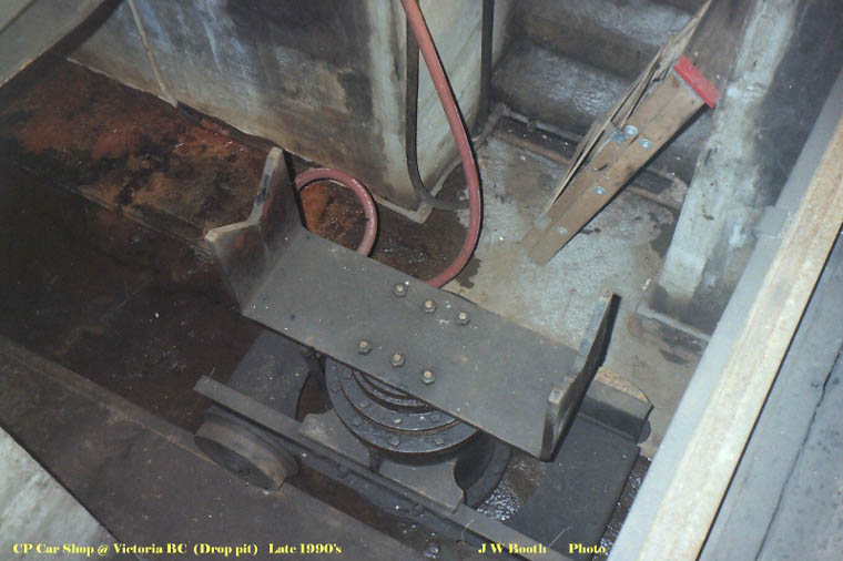 This moveable jack on narrow gauge rails is air operated and is the same type used in roundhouse pits for dropping steam locomotive wheels including drivers.