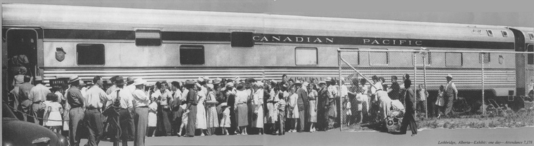 It's August 1954 and Canadian Pacific has put a pair of its new Budd Company stainless steel passenger cars (Banff Park and Chateau Bienville) on public display in downtown Vancouver part of a seven week cross-Canada preview of its coming new flagship passenger train The Canadian during which time more than 200,000 people toured the cars staffed by 18 people and ending at the CNE in Toronto. Today, the yard still exists and is vital to the railway's Vancouver waterfront operations. The area where the coaches are on display has been redeveloped with new platforms to handle West Coast Express commuter trains. Behind it, the transit authorities Skytrain tracks are located as is the systems boarding platform. Also surviving are the station and adjacent building with the parking lot on top. The buildings behind remain but now house offices or condos. The tank car CGTX 8654 with the warning was used to haul tallow, which the railway continues to do to this day from a nearby refractory. Sadly, the CP box car in front of the tank car with the wording "Spans the World" told of an international conglomerate that no longer exists. CPR/Steve Morris Collection Lethbridge, Alberta - Exhibit: one day attendence 7,178.