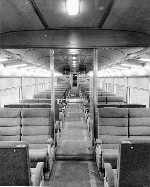Old parlour car interior. Canadian Pacific Railway/donated by Charlie Mabee (CPR Ret'd). Lightweight passenger equipment 1700 smoker on rear of Suburban train 270. One-of-a-kind