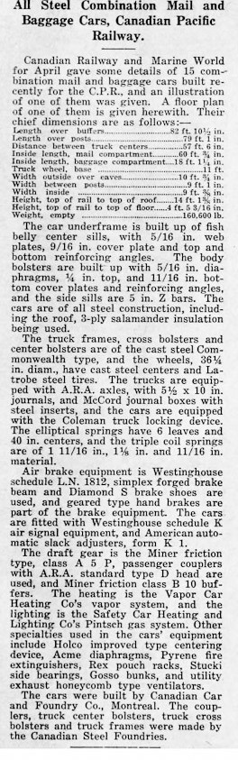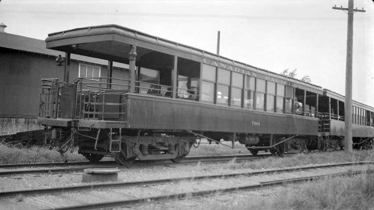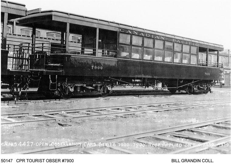 behind the normal open platform observation car. Note: Large building in far right background is the ice house in Revelstoke. CMPRS 4427 open observation cars series 7900-7905 roof applied E.O. 2459 1929 Detailed data and diagrams 7900-7915