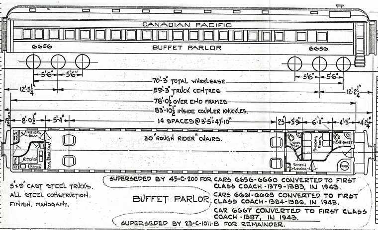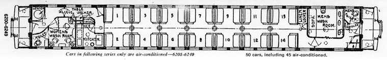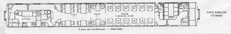 6480 buffet-parlor (4/1952 rebuilt ex cafe-parlor 6556) 16 dining seats 16 parlor chairs.