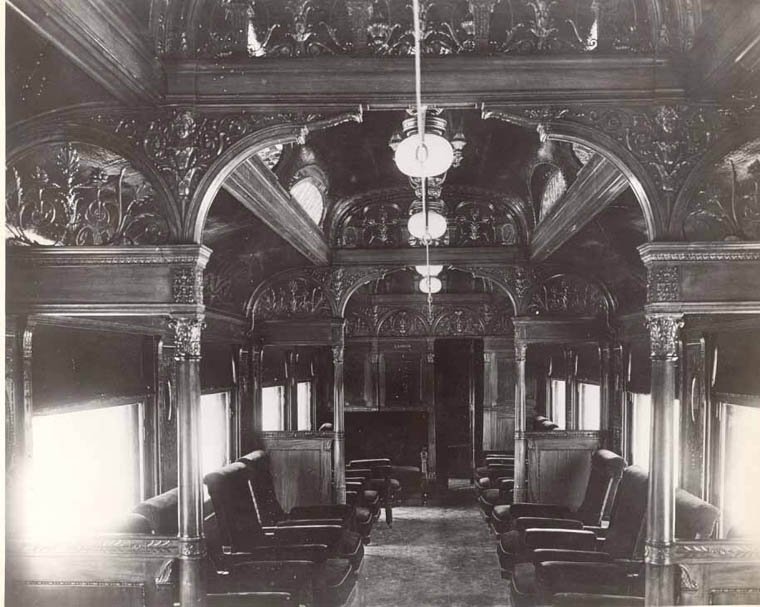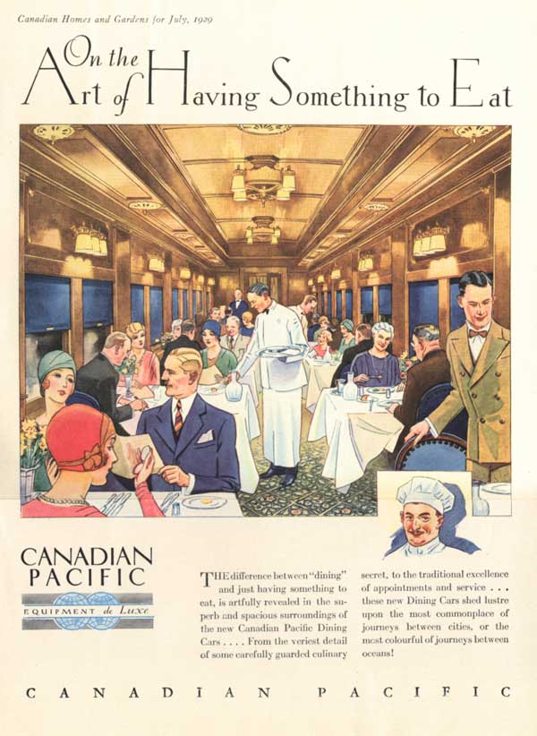 Diner Versailles built Crossen Car Co. Cobourg, Ontario, July 1888. Interior view Versailles 28 seat diner, 70 feet long, 48 tons. Canadian Pacific Railway/donated by Charlie Mabee (CPR Ret'd). On the Art of Having Something to Eat Magazine advertisement 1929 Old Time Trains Archives