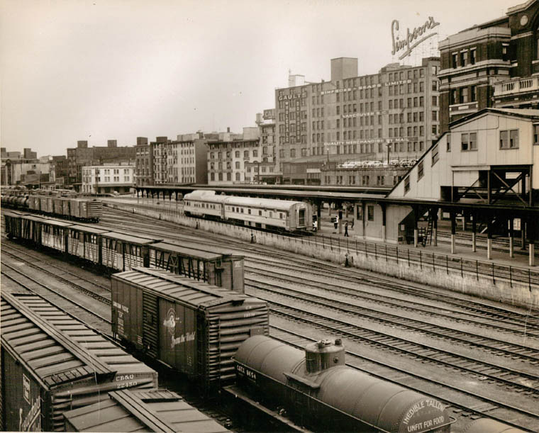 It's August 1954 and Canadian Pacific has put a pair of its new Budd Company stainless steel passenger cars (Banff Park and Chateau Bienville) on public display in downtown Vancouver part of a seven week cross-Canada preview of its coming new flagship passenger train The Canadian during which time more than 200,000 people toured the cars staffed by 18 people and ending at the CNE in Toronto. Today, the yard still exists and is vital to the railway's Vancouver waterfront operations. The area where the coaches are on display has been redeveloped with new platforms to handle West Coast Express commuter trains. Behind it, the transit authorities Skytrain tracks are located as is the systems boarding platform. Also surviving are the station and adjacent building with the parking lot on top. The buildings behind remain but now house offices or condos. The tank car CGTX 8654 with the warning was used to haul tallow, which the railway continues to do to this day from a nearby refractory. Sadly, the CP box car in front of the tank car with the wording "Spans the World" told of an international conglomerate that no longer exists. CPR/Steve Morris Collection