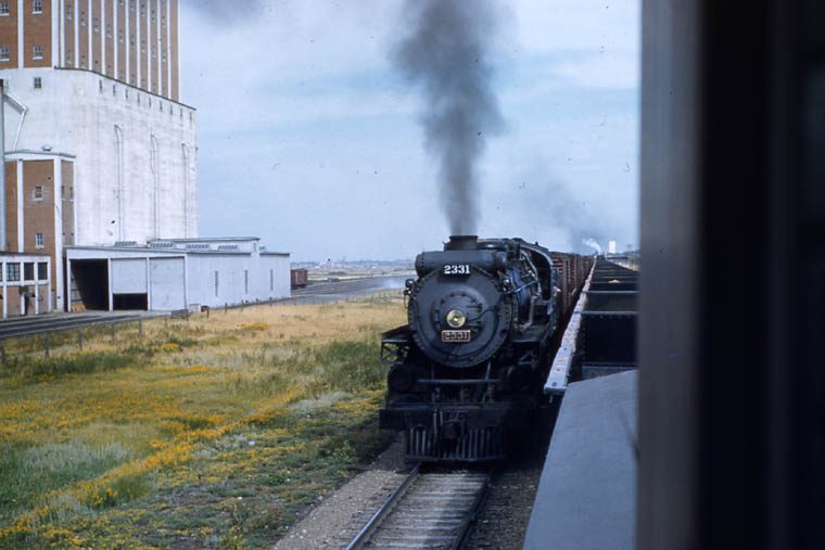 2331 with westbound time freight (965?) passing the Government elevators at Moose Jaw as seen from a Secretan Pit Turn returning with empty hopper cars. Operator and photographer Ron Bearman is riding the van between work and home.