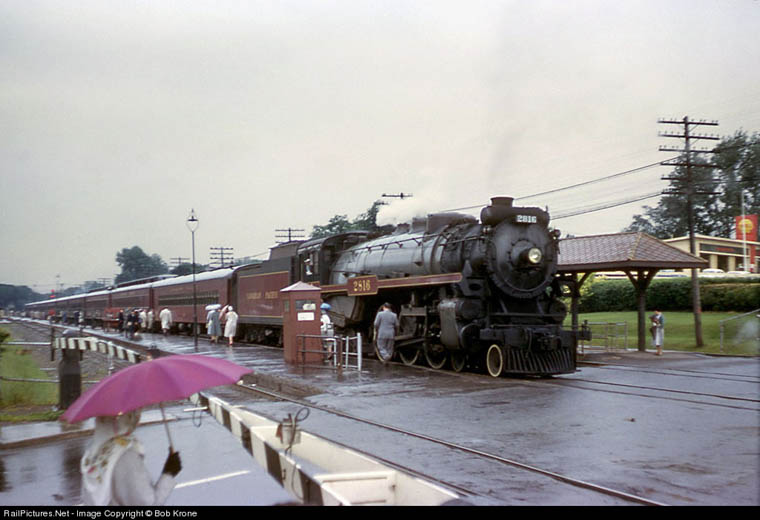 No. 20 engine 2816 eastbound at Galt no longer equipped with smoke deflectors. July 7, 1954. William I. Miller Christmas Eve Thursday, December 24, 1953 No. 629 (The Bullet) was changed from a Dayliner to conventional equipment totalling twelve cars including two RDC's. 2816 hauled that train carrying 969 passengers. Departing Toronto at 3.55 p.m. the heavy weight of the train (it would have been assisted by another passenger engine 60 miles to Orrs Lake) and the high volume of passengers all combined to make it one hour and fifty minutes late arriving at Detroit. The connection through to Chicago was still made due to a three hour and twenty minute layover departing 11.40 p.m. Public time table 1954.