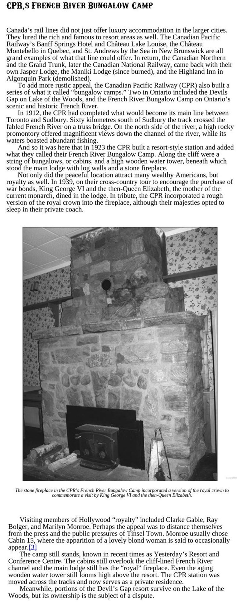 Hunting Available: Other Information Licensed lounge, pool, saunas, whirlpools, sand beach, tennis and daily maid service. Nestled in the natural beauty of the French River wilderness, Yesterdays Resort provides its guests with all the comforts for that special pampered feeling while escaping the hectic pace of everyday life year round! Yesterdays has proudly enjoyed the company of guests from throughout the world. Something to do or nothing to do.... It's your choice at Yesterdays. Golf nearby at your choice of courses, volleyball, horseshoes, and badminton, swimming in the indoor pool or at the sandy beach, relaxing in the sauna or in our hot tub. The Boathouse Marina is equipped with a selection of fishing boats,pontoon boats and kayaks. Yesterdays.... away from city distractions, the perfect venue for productive business meetings retreats & seminars, romantic weddings, showers, reunions, fashion shows, bar mitzvahs, etc. Originally constructed in 1923 by the Canadian Pacific Railway, the resort began as an executive retreat. It was opened to the public in 1928 as a fishing camp. The bungalows were upscale for the time but very simple in comparison to today's elegance. They consisted of either one or two bedrooms with washrooms located in a central building. Guests arrived by CPR trains that stopped at the station house you pass on the way into the resort. This building was refurbished recently and is now a summer home. Hard to believe in today's economy but rates were $ 5.00 per day or $ 30.00 per week full American Plan. The property enjoyed many famous visitors over the years. In 1938, on the last Royal visit before World War II, King George VI and Queen Elizabeth enjoyed dinner in the main dining room & stayed in his private rail car on the property. In honour of this visit, the stone work in the fireplace in the Riverview Dining Room was arranged in the shape of his crown. You can still see this clearly today. In 1945, the property was sold to Clarence Honey who operated it successfully until 1965. During the 50's, the camp became somewhat of a dry out centre for Hollywood. Some of the illustrious guests that stayed on the property were Marilyn Monroe (wonder if she called Jack from the phone booth in the main lobby?) and Clark Gable. During the 60's, the 70's and early 80's, the resort changed hands several times and was renamed Chalet Bungalow Lodge. In the late 80's, its owner at the time lost interest in the resort after the death of his wife although he had begun the updating process. Sold in 1988, to a family from Burlington, Ontario, the property was to undergo a complete transformation from a fishing camp to the luxury resort and conference centre you see today. During the years 1988 through 1992 with an investment in excess of $ 3 million, the Boat House Marina was created while the Stoney Rapids Recreation Hall and Dry Pine Bay Pool building were erected. The individual chalets were ripped apart completely and all underwent a total refurbishing. The lodge was updated, modernized and expanded to add Meshaw Falls Conference facilities and expand the dining area overlooking the river. A grand re-opening was scheduled for 1992 under the new name of Yesterdays. In July1995, South Bay Marina Limited, a privately held company that has been dealing in the tourism industry since 1968, purchased Yesterdays. The resort reopened under the new management team of Larry & Janis Pichette on, July 27, 1995. With an emphasis on group bookings, weddings, retreats, business meetings and conferences, the resort is now enjoying a clear direction to success. Your present hosts Doug, Mike, Rob, Suzanne and Tracy purchased the lodge in 2006 and endeavour to make your stay as comfortable and pleasant as possible. Thank-you for choosing Yesterdays for your destination. If there is anything we can do to make you more comfortable during your visit, please do not hesitate to ask our staff. They will be more than happy to accommodate your needs wherever possible.