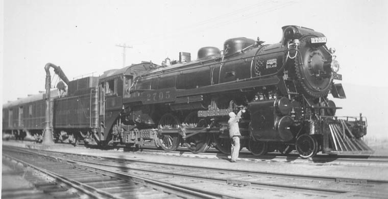 2705 Engineer oiling around while fireman takes water. Sicamous June 1938