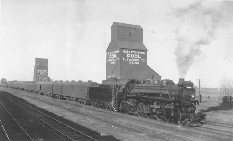Coal-fired 2710 with large tender leads a passenger train through Sutherland, Saskatchewan. November 10, 1936