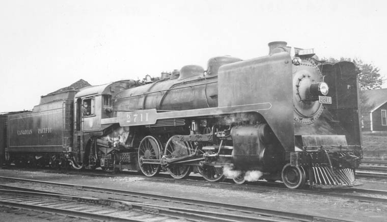 Coal-fired 2711 with smoke deflectors (a.k.a. elephant ears) Brandon, Manitoba. June 1941