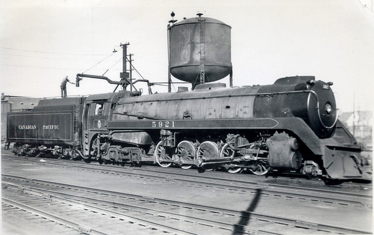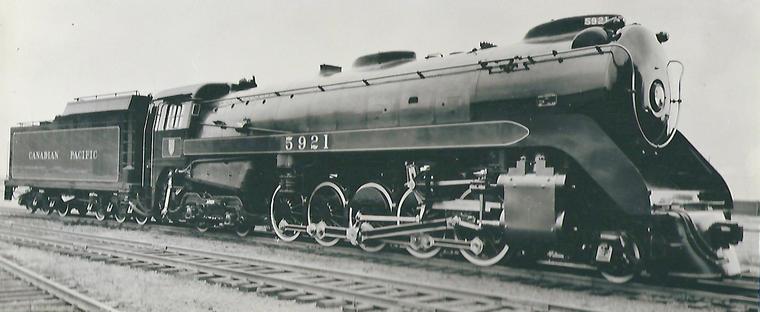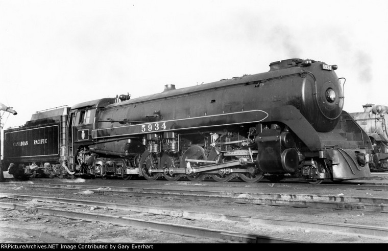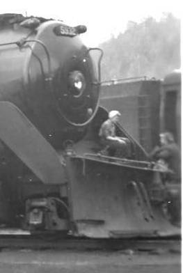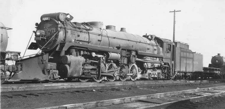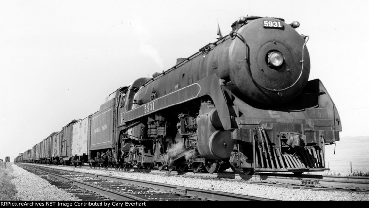 Obviously in freight service in this scene years later than above. T-1-b semi-streamlined 5920-5929 Cyl. 25" x 32" Drv. 63" Press. 285 lbs. 76,900 t.e. plus 12,500 for booster engine. Tender 4100 gals. oil 12,000 gals.water