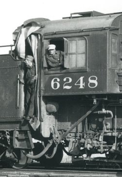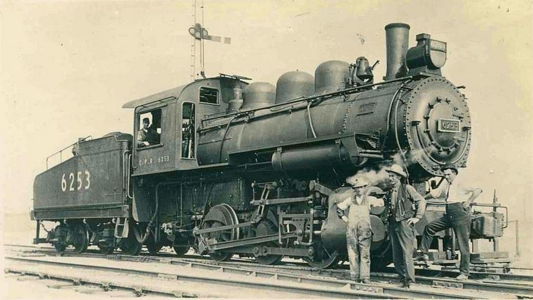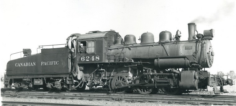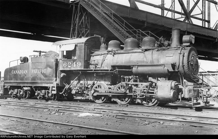 6249 sitting under Arlington Street Bridge which crosses width of entire yard. Note employee stairs. Winnipeg 5/28/1951 6253 poses with crew in this early scene. CPR 7/1912 Scrapped 2/1953. U3e 6260-6304