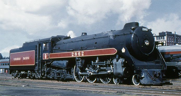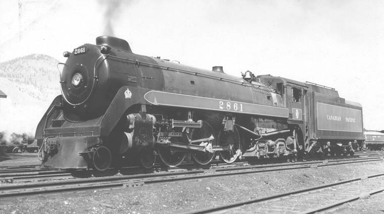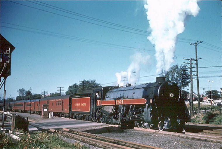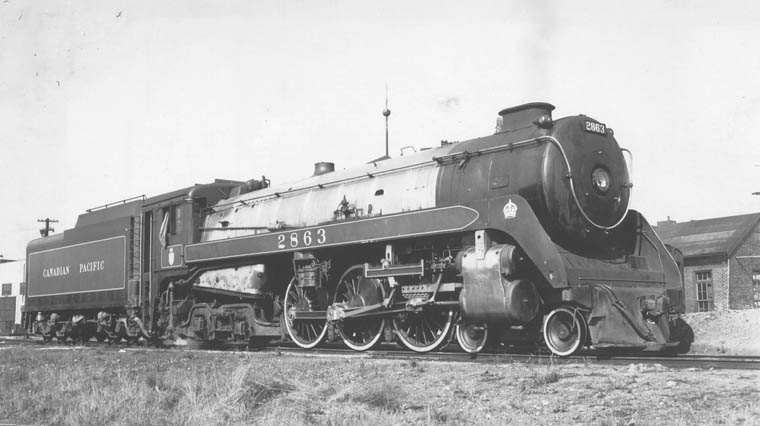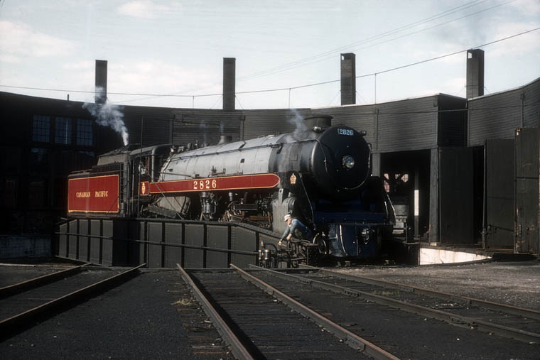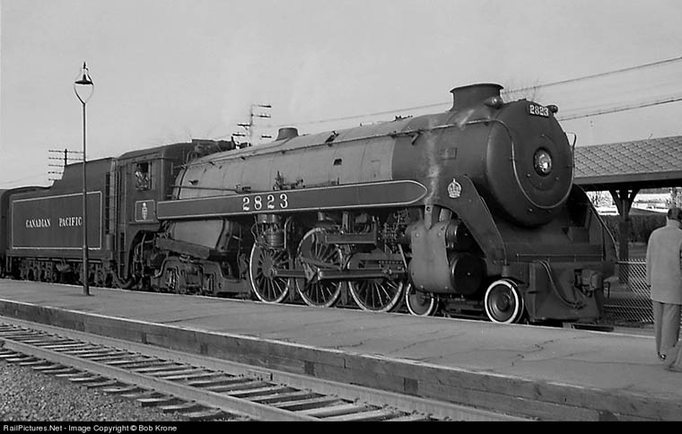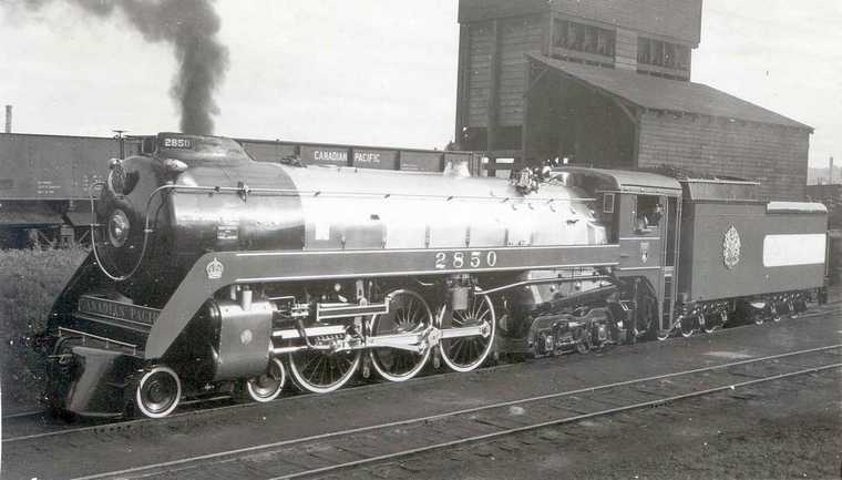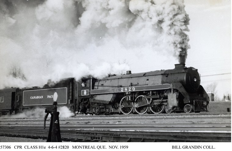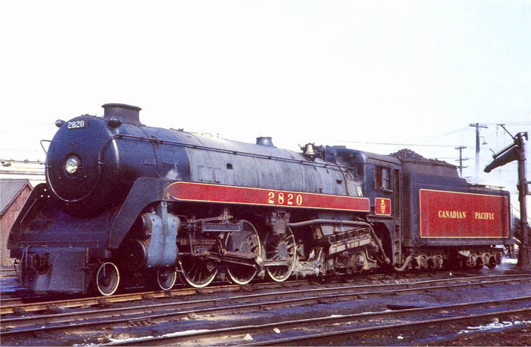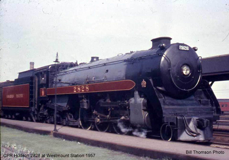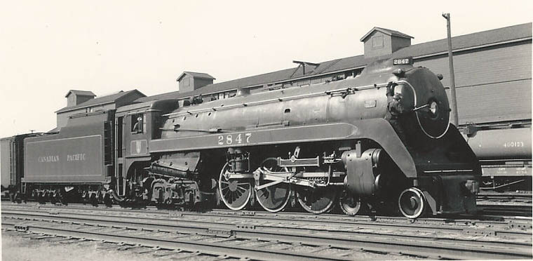The War was over and CP was struggling to get back to normal after the heavy toll on its infrastructure and equipment when this picture was taken in March, 1947 . We see 2828, one of the famed Royal Hudson's backing its way from Glen Yard towards Windsor Station in Montreal. The practice of backing engines down from the Glen Yard shop track two miles to Windsor Station could be challenging for firemen and enginemen half hanging out windows during winter blizzards or when the temperature dipped to the -20s. During the 1430-1600 hr. period there would be a steady stream of cleaned and serviced engines making their way from Glen Yard to Windsor Station and coupling up to their respective trains. Engine 2828 was built in October, 1937 and scrapped almost to the day she was built in October, 1958 after only 21 years of service. The Glen Yard was the engine's "home" . Both the engine and the yard are now just memories. Canadian Pacific Railway /Steve Morris Collection