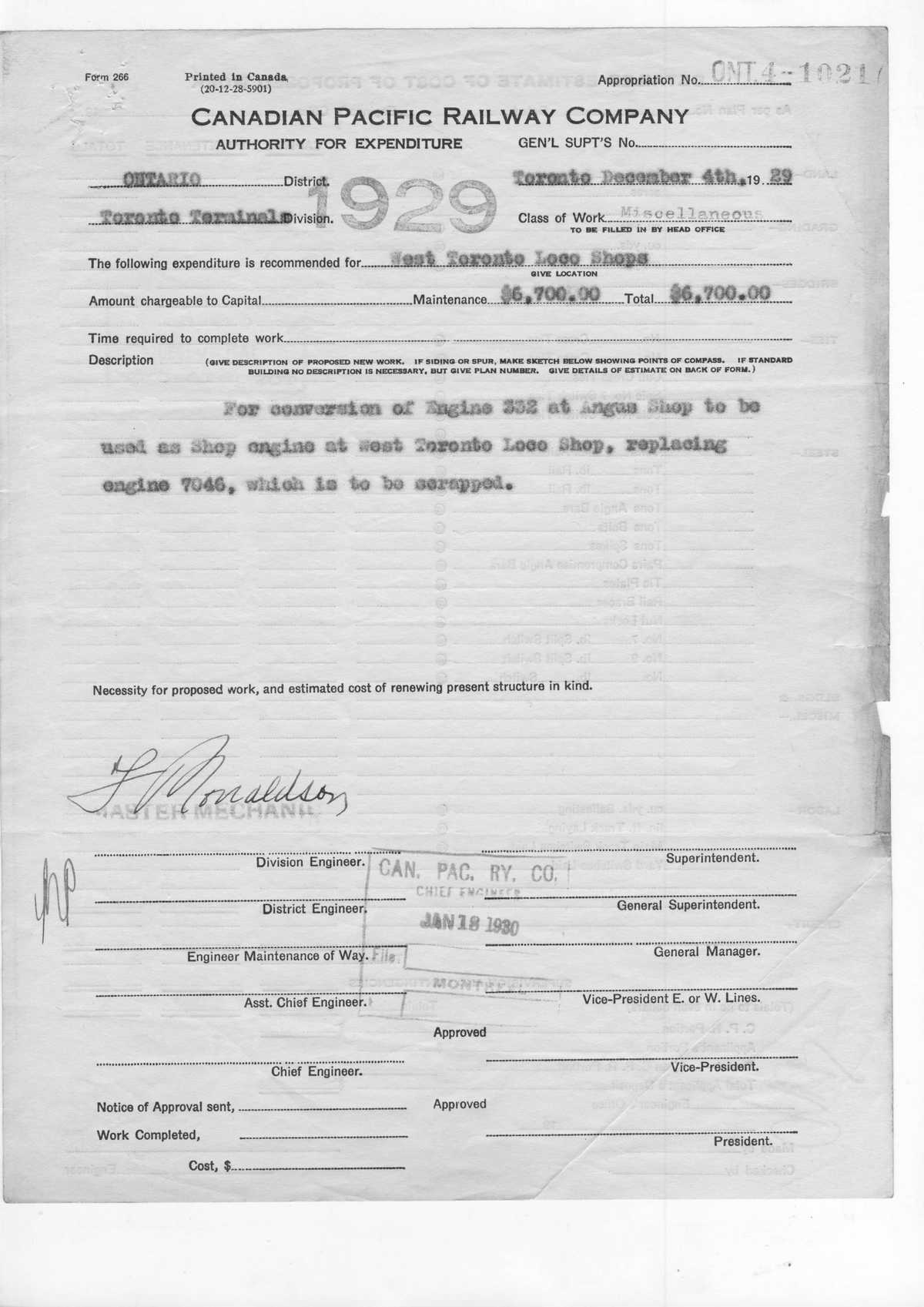 Re# S.L.3 1943 Note: Originally intended 1929 for West Toronto main shops to replace SL 7046 ex 7046 4-4-0 1919. S. l. 2 (4-6-0 ex 332 1930 Shop Tool L.1500 Ogden) Re# 1930 S.L.2.