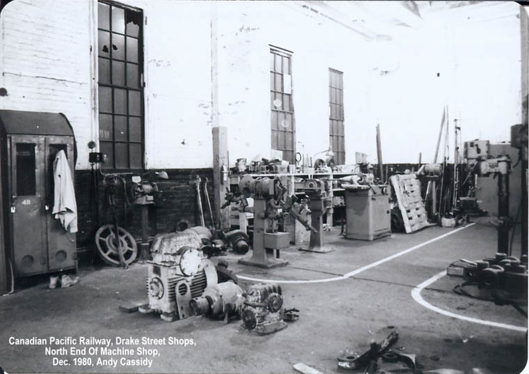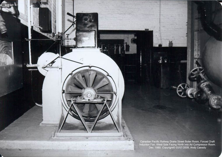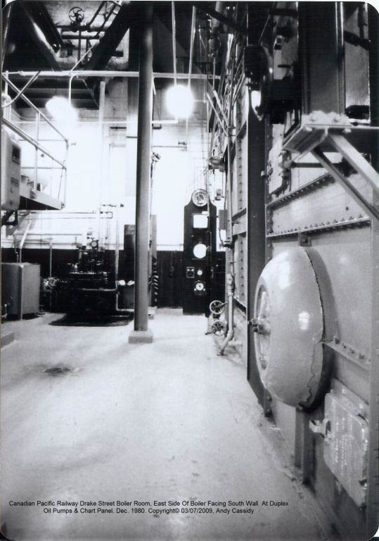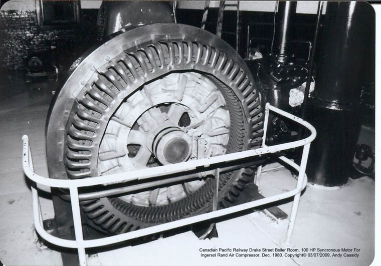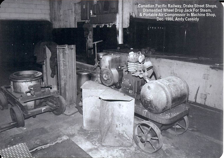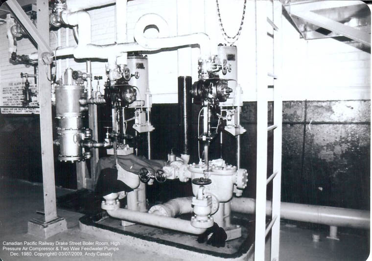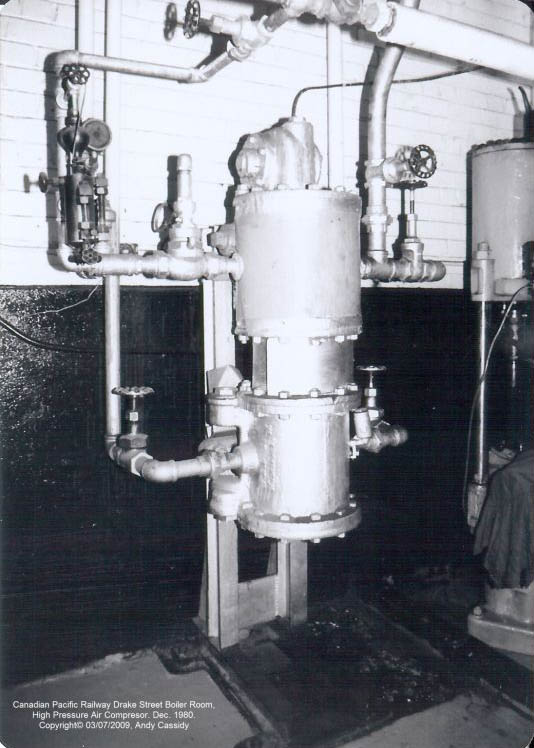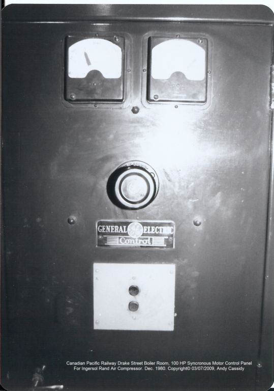 These three shots are of the Compressor Room and the equipment therein. This Canadian Ingersol Rand compressor ran flawlessly for years. It had a 100 HP GE synchronous motor operating it. When this thing was pumping you could hear it all around the shop. Never ran low on air that I can remember. As opposed to the same compressor that was in place at Coquitlam but run by a 100 HP Westinghouse Motor that was constantly giving trouble. I chalked this up to the physical size difference between the two motors. The GE was considerably larger in every aspect. So I guess the Westinghouse Engineers figured cheaper = better, but that was not the case. In any event, this particular machine ended up with a second career for many years after at the BC Rail Steam Shop where the Royal Hudson, CP 2860, was maintained till the BC government shut down the operation a number of years ago. Not sure where it is now.?