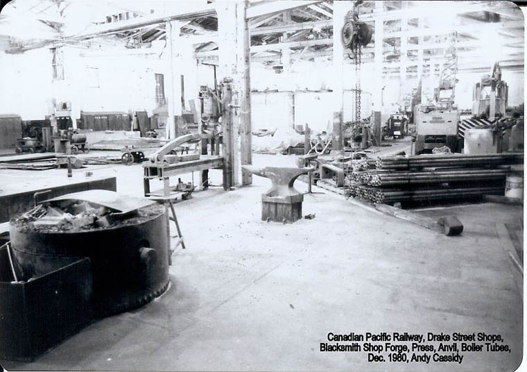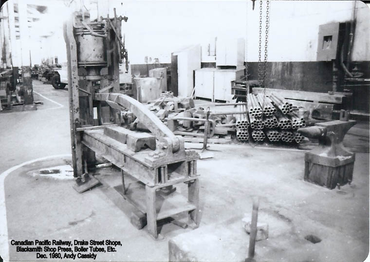 Looking north through the Blacksmith area. You can see the Forge and Air Press straight ahead. Some boiler tubes to the right of the Anvil. And a pipe rack on the right. Reminds me of another good story. When I was first an apprentice, one day the Boiler Maker Apprentice Bob Williams calls me over to that rack. Sitting on the rack was a small freshly orange painted gismo that looked like some twisted circus trumpet. Bob tells me that this horn makes a sound that the General Locomotive Foreman of the day, Bill Silver, cant stand. He says to blow it as hard as I can, then well run like hell! Well, of course I fall for this and give this thing a Big Blow. Next thing I know, my eyes are full of flower, as I didnt notice the two tubes pointed straight at my eyes amongst this maze of piping. Yelling obscenities, all I hear is the whole shop laughing. They were all hiding in the woodwork. In the mean time Im running to that trough, described above, to dunk my head in to get that crap out of my eyes. That water was ice cold! I was some ticked off, let me tell you. In the end we all had a good chuckle over it. No hard feelings. Just part of the hazing rituals we all went through in those days.